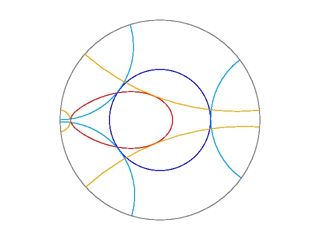 下図右において三本の空色の直線は青い円の接線であり、 三本の黄色い直線は赤い二次曲線の接線である。